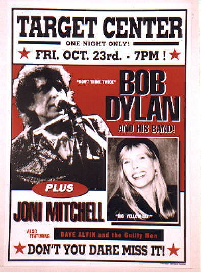 (From:imsdahl1@brainerd.net)-We loved watching Joni's body sway to the beat of her inner voice, we only wish we could have heard her lyrics! We had never attended a concert at the Target Center and never will again! We had balcony seats and we were so disappointed to have traveled so far for so little sound. The thrill of seeing Joni and Dylan, who was at his best, still made it worth the money. Yes! we agree the Fine Line would be a great place for her to sing for all of us, {Re: Arlo Guthrie, Mill City Music Festival 97} Also, in an over 21 club... we would not have to tell 14 year olds to be quiet and to stop spilling their soda, like we did with the group sitting behind us last night! We are more than happy to share our love of Joni and Dylan with the younger generation, but the groups around us seemed more intent on attending a social event. { Can't believe we are saying that...I guess we are middle age!