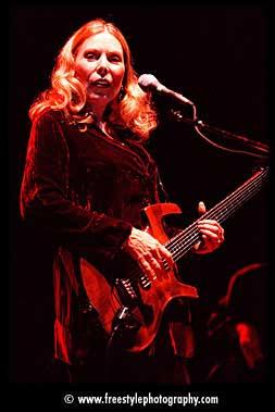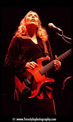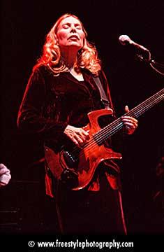The Corel Center crowd greeted Joni with a heartfelt standing ovation, which seemed to please her. Big Yellow Taxi was performed solo, and almost immediately I was taken with the quality of the sound of Joni's Roland VG-8 guitar. Flawless intonation and crystal clear quality was evident. The guitar was mixed in stereo in the arena sound system, giving an even broader audio spectrum to the experience. All the audio/technical aspects aside, what was even more impressive was Joni's sense of time. Her rhythmic energy and forward motion is on par with any jazz player I've seen.