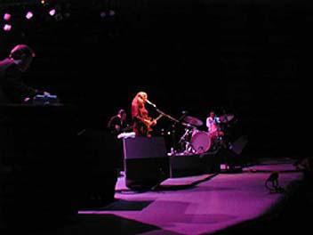 She really seemed to be in her prime, as far as voice, her music, her new interpretation of her standards, her new material, and the band. The band was so very, very tight. The jazzy tone kept us swaying through many of the songs. Brian Blade on drums was exquisite, and it was a great statement to have him placed in front. Hearing Larry Klein on bass together with Joni was such a treat. He seemed to be so much in synch with her and the rest of the band, e s p e c i a l l y during Black Crow, Amelia, & Hejira. The entire set was one peak after another. However, if I was forced to choose my favorite I would choose two songs. The first was "Don Juan's Reckless Daughter". This song has always intrigued me, and honestly was not one of my favorites. I never ever thought she would sing it on tour! Her performance was so unique and the band so tight, that the song instantly became one of my new favorites. They seemed to be having so much fun together on it, and perhaps they had loosened up by this time, that it seemed they were blowing the roof off the hall. People in my row where dancing, even some of the Dylan fans. The second was "Hejira", we were floating above our chairs during this one. æ