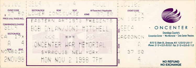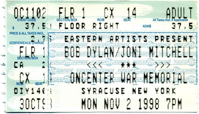 In contrast to my solo flight to A Day At the Garden last August, I arrived at the Syracuse War Memorial with a crowd of my good friends from Cornell who have been very excited for the past few weeks to see Joni for the first time. Many of them were big Dylan fans and I made sure they got a copy of my Joni compilation tape to prime them for their first SIQUOMB experience.