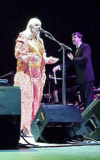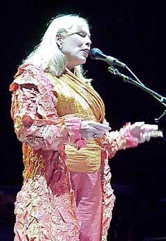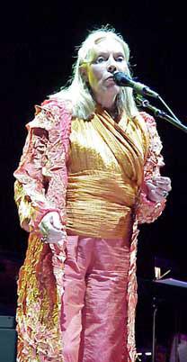 Joni's performance of her current "Both Sides Now" album took on a brilliance that's hinted at on the CD, but not as fully revealed. Her voice shone, and soared, and shimmered, and simmered! Joni is clearly having the time of her life singing these tunes, and in live performance, she truly gave them something that no one else could give.... she gives them JONI. As she moved with the music, seemingly slow-dancing with it, romancing it, caressing it, she swept us all away on her journey through the stages of romantic love. This is her time to "put the guitar down, step away from the piano and just enjoy singing, y'know ..." she told her warm and affectionate Boston audience at the start of the show. And sing she did, in beautiful voice and with exquisite styling and nuance.