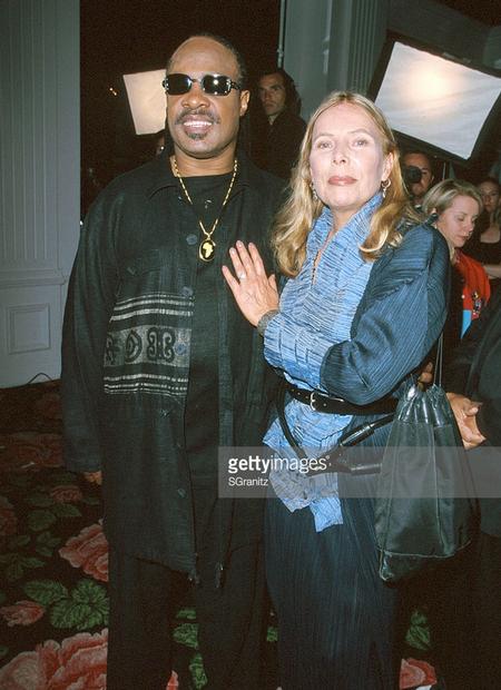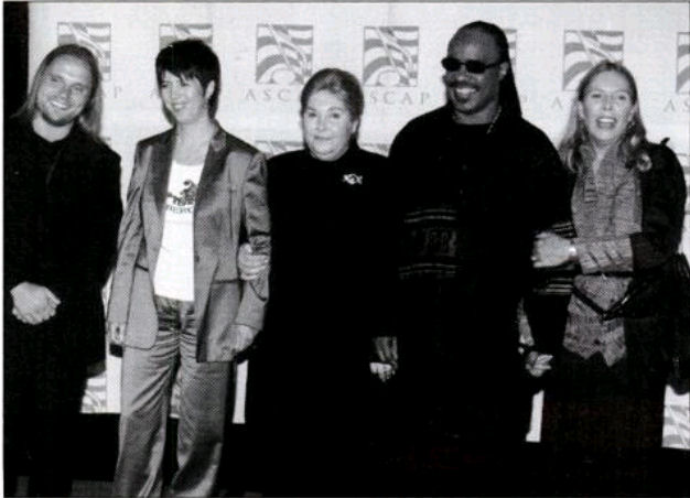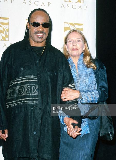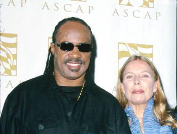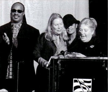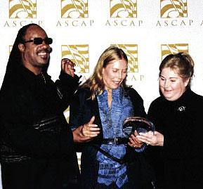 ASCAP President and Chairman, Marilyn Bergman, made a few introductory remarks about Joni, saying "This award recognizes a truly original talent in music, a woman whose classic songs have succeeded as works of art and as commercial successes...Joni Mitchell's influence has been incalculable, and she is most deserving of this award, the highest honor ASCAP bestows on a songwriter." This was followed by a performance of Joni's song, "Woodstock," performed by Stevie Wonder (who arrived at the show in a big yellow taxi). His performance was so moving that it apparently brought the audience of celebrities to their feet and Joni to tears. Then a marvelous eight and a half minute film on Joni's career was played. After the film, Stevie, Marilyn and Janet Jackson made the presentation of the Founders Award to Joni. Joni was humbled and said that since there were so many clips in the film of her talking about her music and career that there wasn't much left to say. So she said a simple "Thank you."