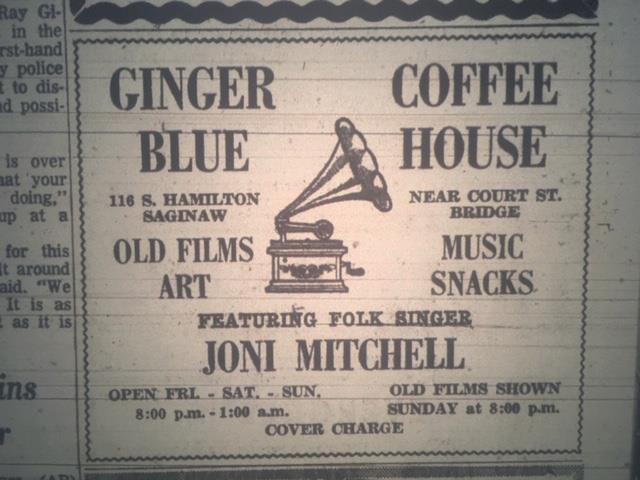 [Comment found elsewhere on the web, from 21 January 2007]: I was at Joni's Ginger Blue performance in 1967. The place was quite empty, Saginaw not being particularly hip at the time. We were seated four feet from her. She sang and played like an angel. I was riveted to her presence and sound, knowing that I was witnessing true artistry. A friend of mine at the Saginaw Library is doing some research for me regarding the former owner Mary Cady.