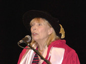 Susan: I got to Redpath Hall five minutes before the end of the afternoon panel at 3:30 - I'd have to wait until 4pm before the last part the Roundtable...everyone got up to go out side for a break...and in comes Joni Mitchell from a side door followed by a stream of cameras and reporters and journalists...boom mikes. She looked stunning - red blouse and sleevless top red and grays and blacks...a very fashion statement skirt and red shoes ...kinda like Dorothy from the Wizard...