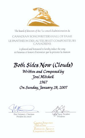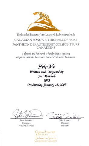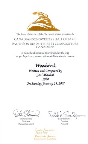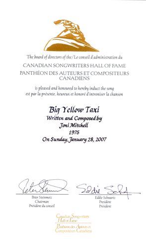 Co-host Andrew Craig said, "Joni's songs took us places. Her words challenged us to feel." He said he was proud to induct her songs, "Big Yellow Taxi," "Both Sides Now," "Help me", "You turn me on, I'm a radio" and "Woodstock."
