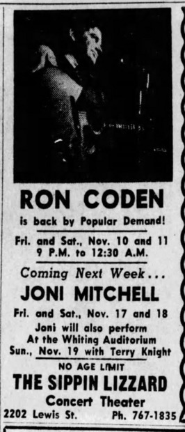 1967.11.17 Joni's next appearance The Sippin' Lizzard Coffee House Flint, MI