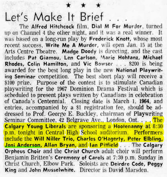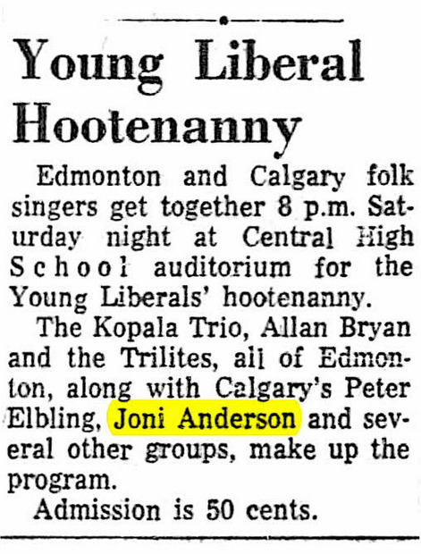 1963.12.14 Joni's next appearance Young Liberals' Hootenanny — Central High School Calgary, AB