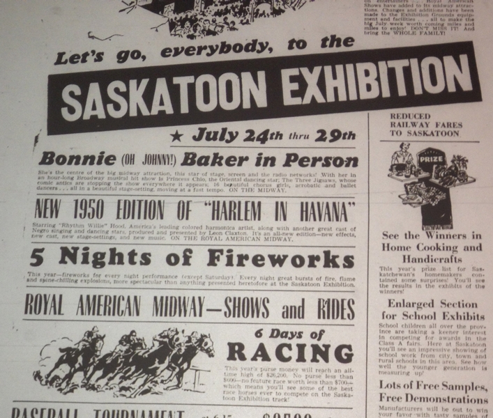 Page from a 1950 edition of the Saskatoon StarPhoenix advertising Harlem in Havana. Copy reads "Starring 'Rhythm Willie' Hood, America's leading colored harmonica artist, along with another great cast of Negro singing and dancing stars, produced and presented by Leon Claxton. It's an all-new edition - new effects, new cast, new stage-settings, and new music, ON THE ROYAL AMERICAN MIDWAY."