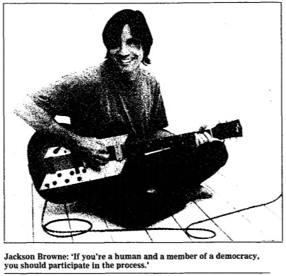 Browne, however bristles at the suggestion his career has suffered because of his activism. [It] may be true in some general way." he conceded. "But one of the by-products may be that people feel guilty of not knowing the [U.S.] foreign policy on Central America, so I may be succeeding at some level if I'm making people aware of it for only a moment. ...If you're a human and a member of a democracy, you should participate in the process."