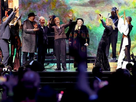 Walking with a cane following the injury, Mitchell then joined singers Sarah McLachlan, Allison Russell, Jully Black and others for a version of her 1970 smash hit Big Yellow Taxi. She took up a microphone during the performance to drop a few verses of the classic song as the musicians around her made clear how honoured they were to be sharing the stage with such a legend.